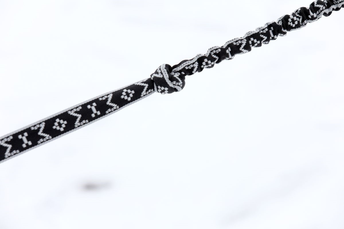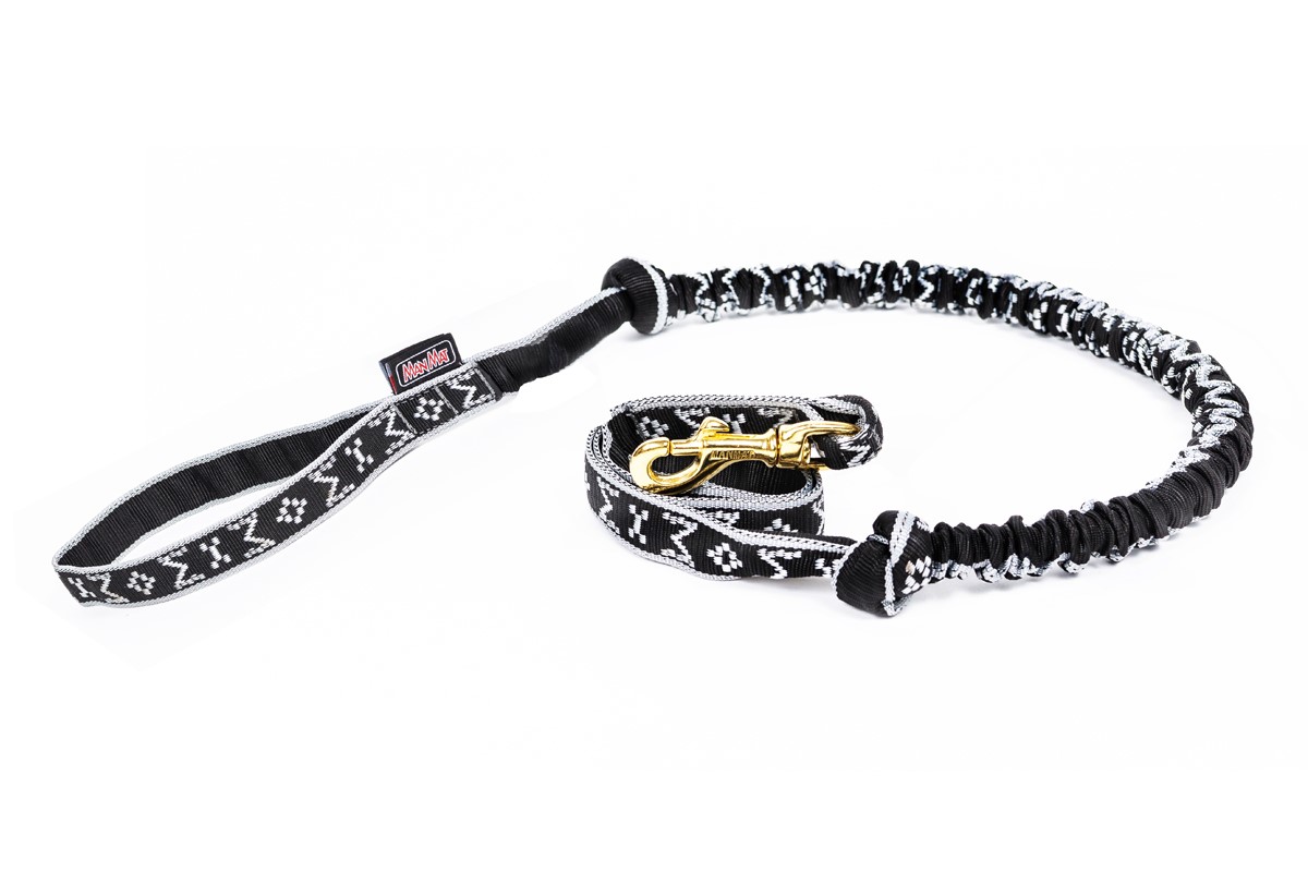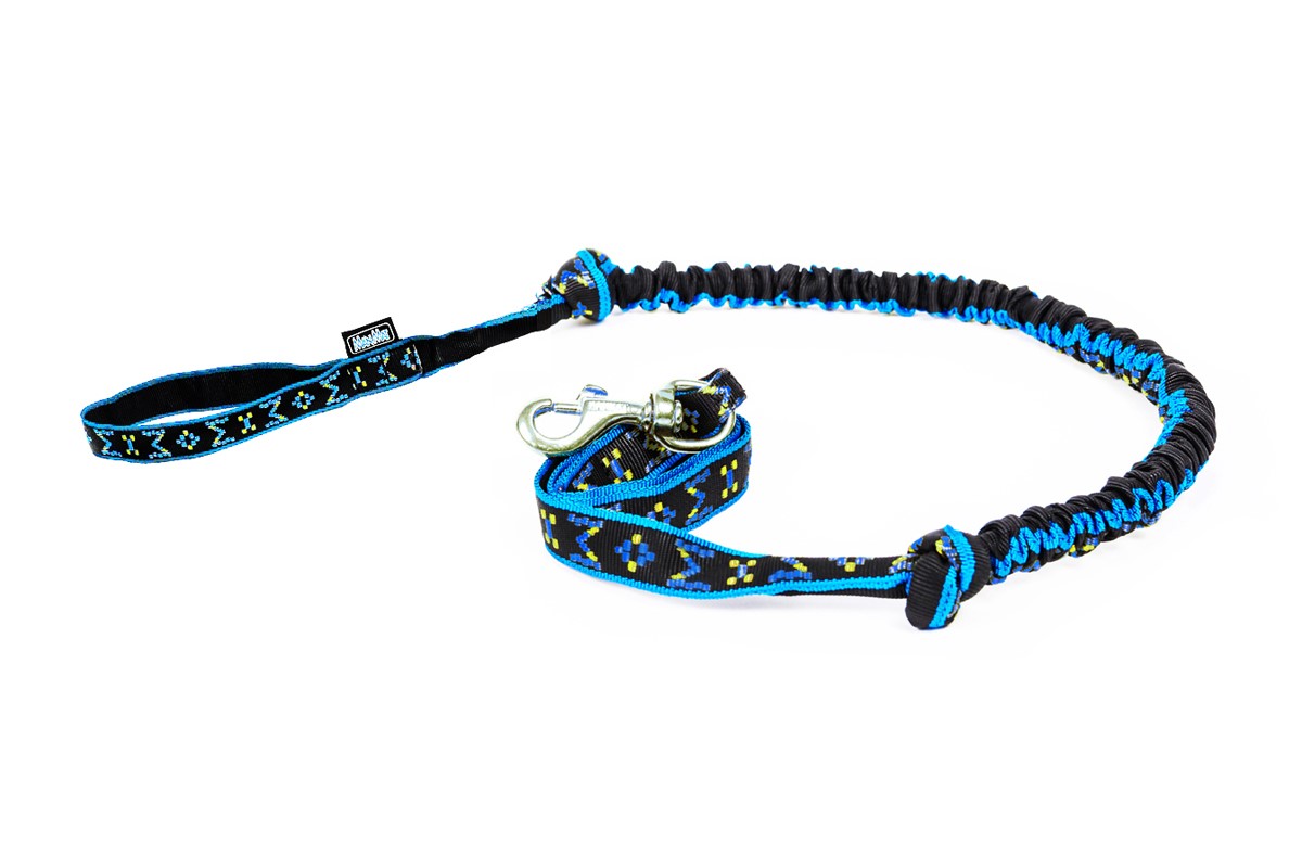 Taluttajan päässä on käsilenkki ja joustopätkä vähentämässä koiraan sekä taluttajaan kohdistuvia nykäyksiä.